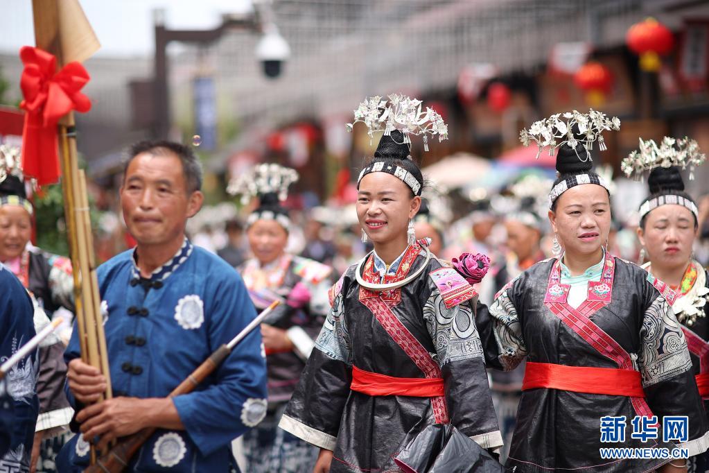 當(dāng)日,貴州省黔東南苗族侗族自治州丹寨縣萬達(dá)小鎮(zhèn)在“第二屆中國丹寨非遺周”中舉辦苗族盛裝巡游、非遺歌舞展演活動(dòng)。