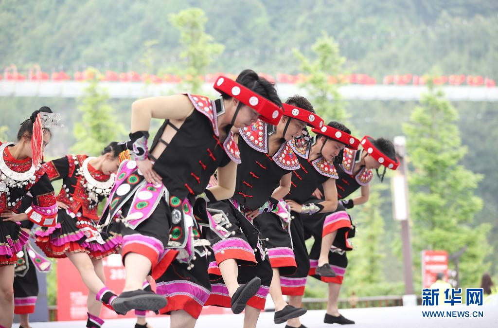 5月16日,演員在丹寨縣萬達(dá)小鎮(zhèn)非遺歌舞展演活動(dòng)上表演苗族踩鼓舞。