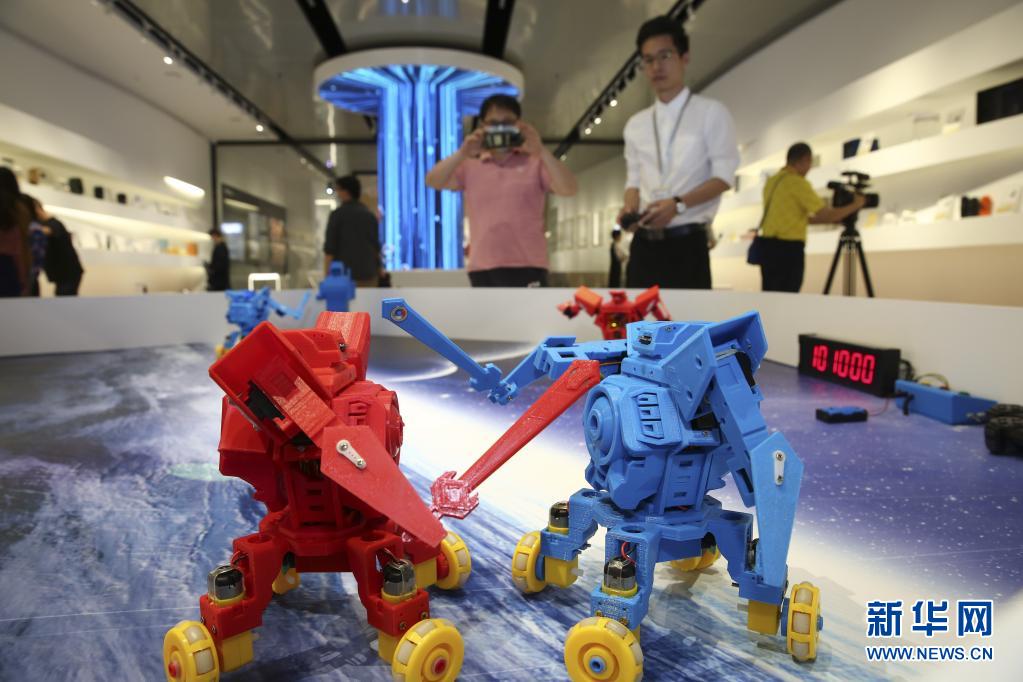 在廣東工業(yè)設(shè)計(jì)城創(chuàng)新科技館,工作人員在展示機(jī)器人“速斗無(wú)人區(qū)”(4月19日攝)。新華社記者 殷剛 攝