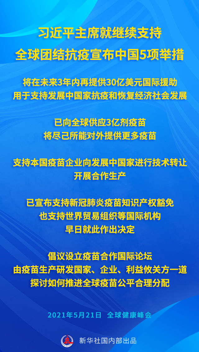 2021年5月,面對(duì)全球疫情的起伏反復(fù),著眼全人類共同需求,習(xí)近平主席在全球健康峰會(huì)上又提出5點(diǎn)意見(jiàn)、宣布5項(xiàng)新舉措。