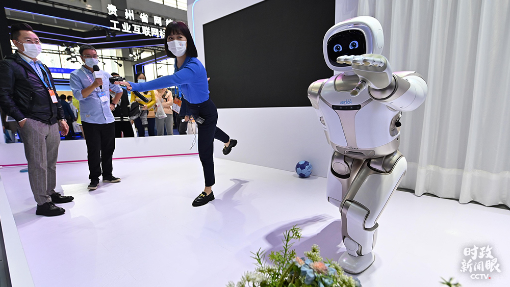 △2021年5月,貴陽,參會者在數(shù)博會上觀看一款能澆花、遞送飲料、踢球的智能機器人。(圖/視覺中國)