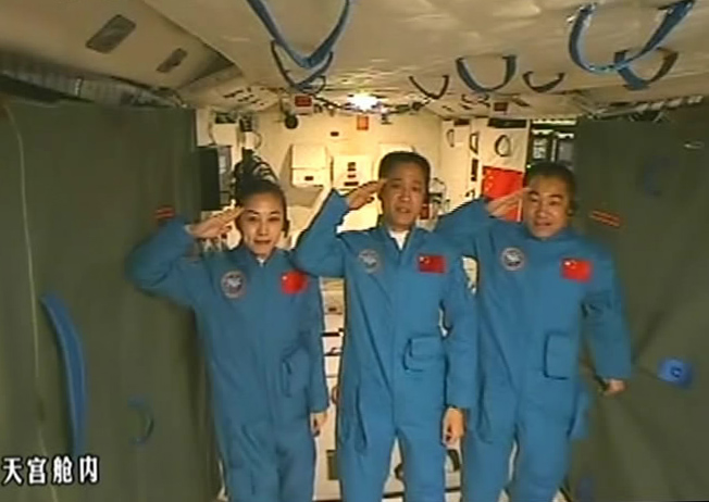 ↑6月17日在北京航天飛行控制中心拍攝的進(jìn)駐天和核心艙的航天員向全國人民敬禮致意的畫面。