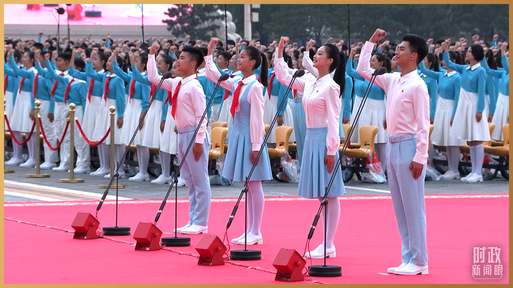 8點(diǎn)整,慶祝大會(huì)開始。100響禮炮響徹云霄。現(xiàn)場升國旗、奏唱國歌。此后,各民主黨派、工商聯(lián)和無黨派人士聯(lián)合致賀詞,由共青團(tuán)員和少先隊(duì)員組成的千人方陣集體致獻(xiàn)詞。