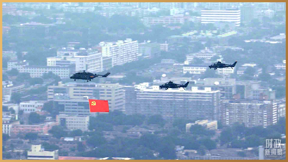 △直升機(jī)懸掛鮮紅的中國共產(chǎn)黨黨旗飛過。