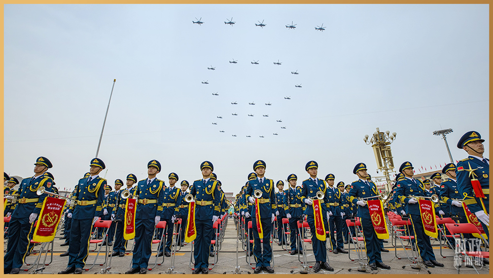 △29架直升機(jī)組成“100”字樣掠過長空。(總臺(tái)記者廖江衡拍攝)