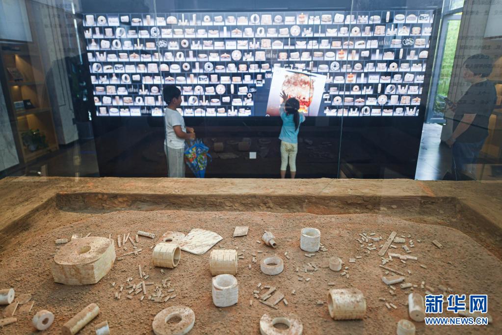2020年6月6日,小游客在浙江省杭州市余杭區(qū)瓶窯老街的“良渚玉雕館”內(nèi)通過(guò)電子屏學(xué)習(xí)玉雕知識(shí)。新華社記者 徐昱 攝