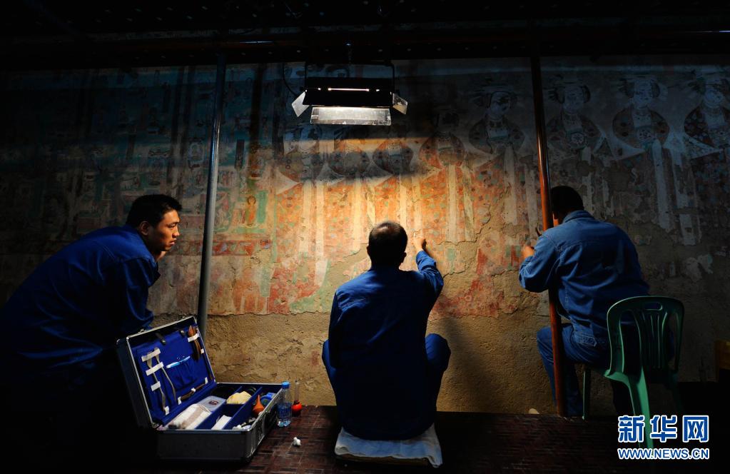 敦煌研究院技術(shù)人員在莫高窟98窟內(nèi)對(duì)病害壁畫(huà)進(jìn)行修復(fù)(2014年9月3日攝)。新華社記者 陳斌 攝