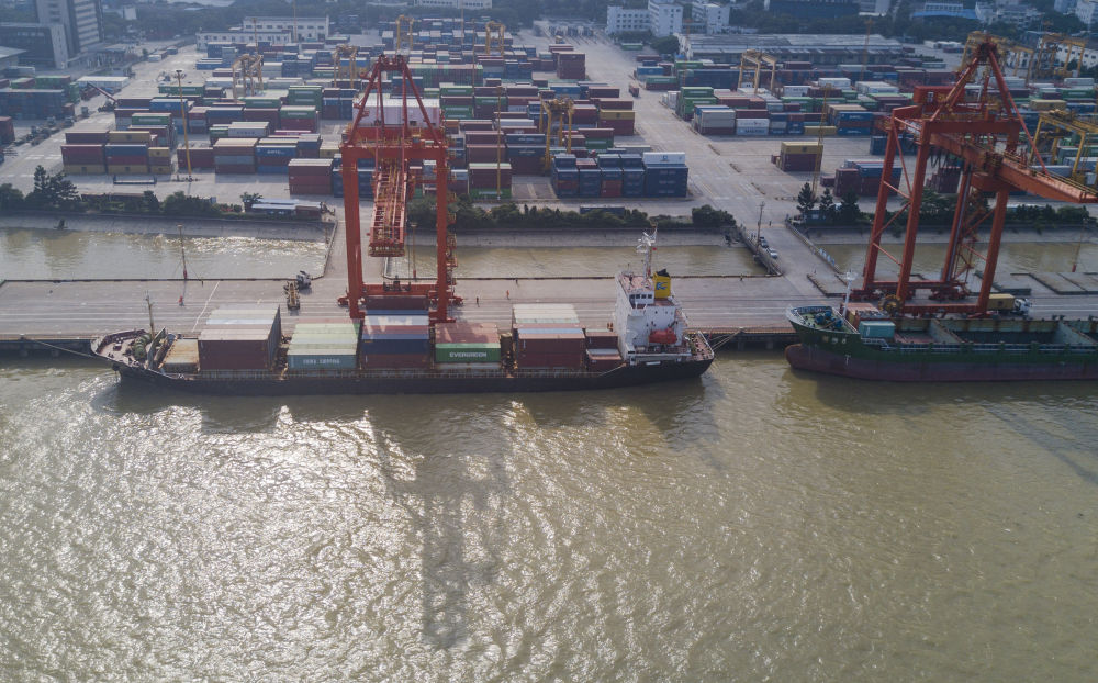 2021年6月3日,集裝箱貨輪??吭谥袊?guó)(福建)自由貿(mào)易試驗(yàn)區(qū)福州青州集裝箱碼頭(無(wú)人機(jī)照片)。新華社記者 宋為偉 攝