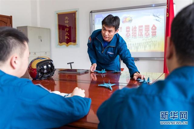 空軍航空兵某旅副參謀長姚凱(中)在大隊(duì)講評(píng)室給年輕飛行員講述對(duì)抗空戰(zhàn)比武中的經(jīng)驗(yàn)教訓(xùn)(2018年9月14日攝)。新華社發(fā)(張皓陽 攝)