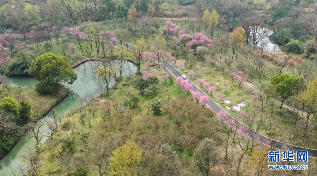 觀(guān)光車(chē)在浙江杭州西溪濕地內(nèi)行駛(2021年3月2日攝,無(wú)人機(jī)照片)。 新華社記者 翁忻旸 攝