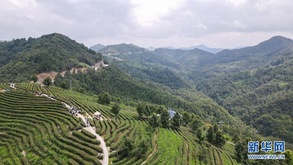 游客在位于陜西省安康市平利縣老縣鎮(zhèn)蔣家坪村的女?huà)z鳳凰茶業(yè)現(xiàn)代示范園區(qū)參觀(guān)游玩(2021年7月24日攝,無(wú)人機(jī)照片)。 新華社記者 徐欽 攝