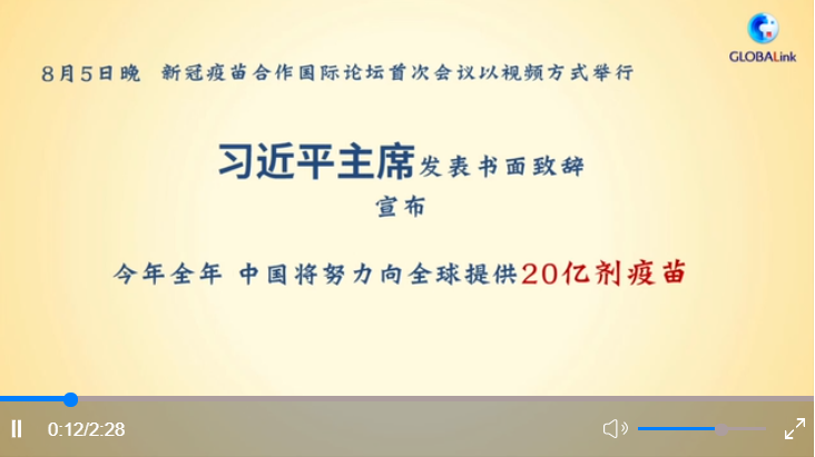 新冠疫苗合作國(guó)際論壇首次會(huì)議5日晚以視頻方式舉行。習(xí)近平主席向會(huì)議發(fā)表書(shū)面致辭。