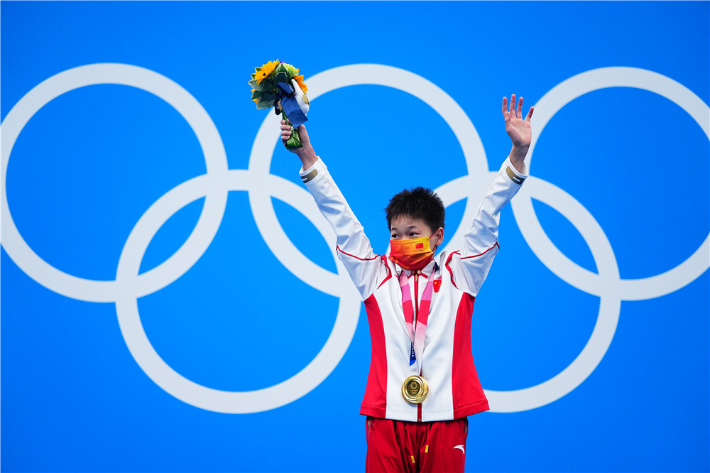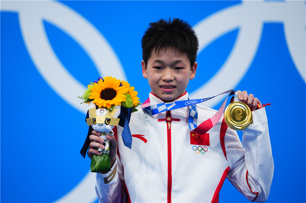 2021年8月5日,全紅嬋在頒獎儀式上。當日,在東京奧運會跳水項目女子10米跳臺決賽中,中國選手全紅嬋奪得冠軍。新華社記者 許暢 攝