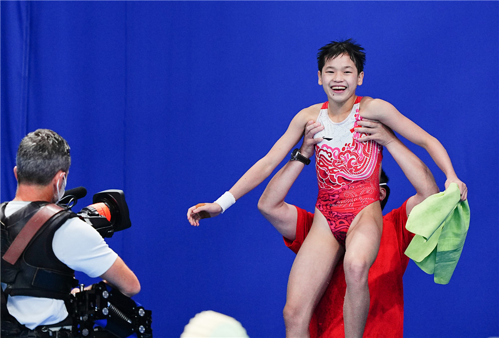 2020年10月,在開賽前三周剛剛掌握5個全套比賽動作的全紅嬋首次代表廣東隊,出戰(zhàn)全國跳水冠軍賽并一舉奪金,力克陳芋汐和張家齊等世界冠軍。“爆冷”“黑馬”“出乎意料”……此后她的每一次亮相,帶來的都是驚嘆號:在三站奧運選拔賽中兩奪冠軍,以總積分第一的成績獲得奧運資格。