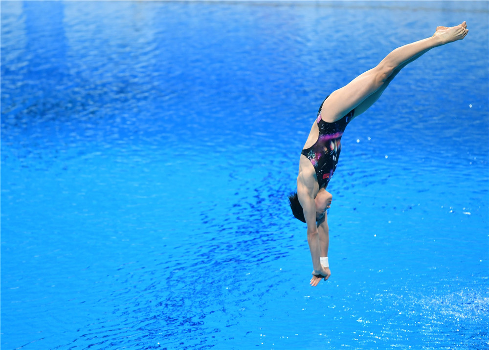 2021年5月13日,全紅嬋在比賽中。當日,在上海舉行的2021年全國跳水冠軍賽暨東京奧運會選拔賽、全運會跳水資格賽女子10米跳臺決賽中,廣東海印選手全紅嬋奪得冠軍。新華社記者 方喆 攝