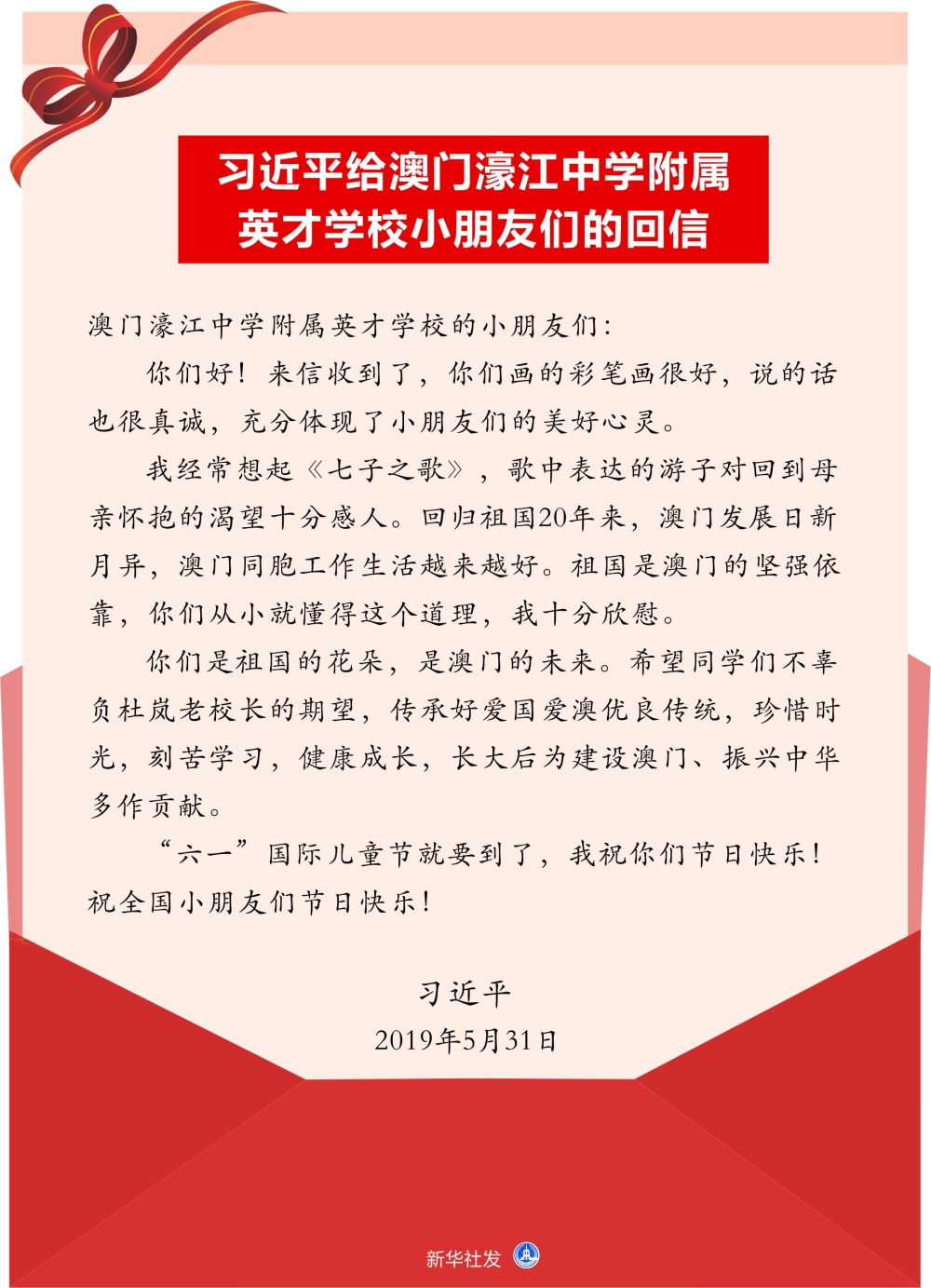 ↑習近平給澳門濠江中學(xué)附屬英才學(xué)校小朋友們的回信。新華社發(fā)