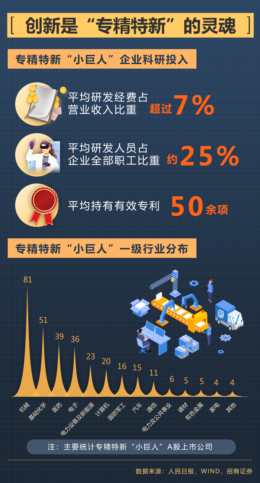 “小巨人”企業(yè)在多個關鍵領域為龍頭骨干企業(yè)配套,也在細分領域持續(xù)創(chuàng)新并占據市場領先地位。這些企業(yè)注重制造業(yè)細分領域的創(chuàng)新,在上天、入海、探月、高鐵等大國工程中,都能找到“小巨人”企業(yè)的產品。根據招商證券統(tǒng)計,A股上市的專精特新“小巨人”企業(yè)中,機械行業(yè)的占比最高,基礎化工、醫(yī)藥、電子等緊隨其后。