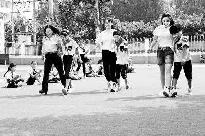 河北省邯鄲市廣平縣濱河小學(xué)教師們和學(xué)生一起在趣味運(yùn)動(dòng)活動(dòng)中參加“二人三足跑”項(xiàng)目。程學(xué)虎攝/光明圖片