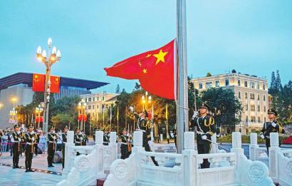 “向國旗——敬禮!”隨著國旗護衛(wèi)隊領隊發(fā)出響亮的口令,護旗隊員行舉槍禮。