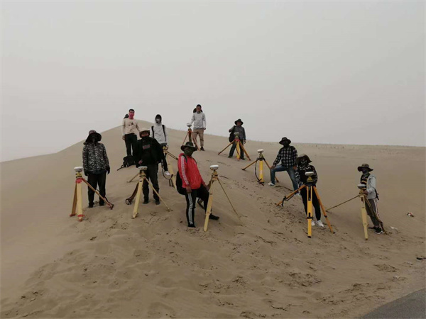后來,唐飛帶領(lǐng)團(tuán)隊(duì)又前往新疆若羌,為中鐵一局三公司和若鐵路項(xiàng)目進(jìn)行前期控制網(wǎng)復(fù)測(cè)。項(xiàng)目線路長、地廣人稀,且地處塔克拉瑪干沙漠邊緣。為了節(jié)省時(shí)間,每天早上他和隊(duì)員背著馕、咸菜、礦泉水出發(fā),在沙漠戈壁一測(cè)就是十二個(gè)小時(shí),晚上八九點(diǎn)左右才能回去吃口熱飯。有一次,他們?cè)诠さ厣蠝y(cè)量時(shí),突遇沙塵暴,他和三個(gè)組員趕快收拾儀器,裝進(jìn)儀器箱,四個(gè)人圍在一起,等著沙塵暴過去。