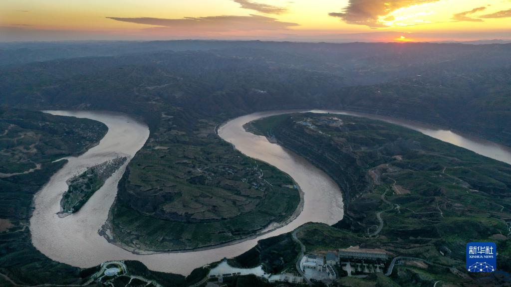 朝霞下的黃河乾坤灣(2019年8月14日攝,無人機(jī)照片)。新華社記者 陶明 攝