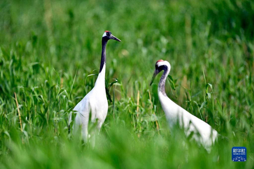 在山東黃河三角洲國家級自然保護(hù)區(qū),丹頂鶴在水草間棲息(2021年5月13日攝)。新華社記者 郭緒雷 攝