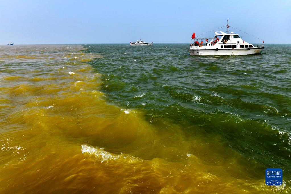 在山東東營市黃河入??冢S河匯入渤海,形成獨(dú)特景觀(2021年5月13日攝)。新華社記者 郭緒雷 攝