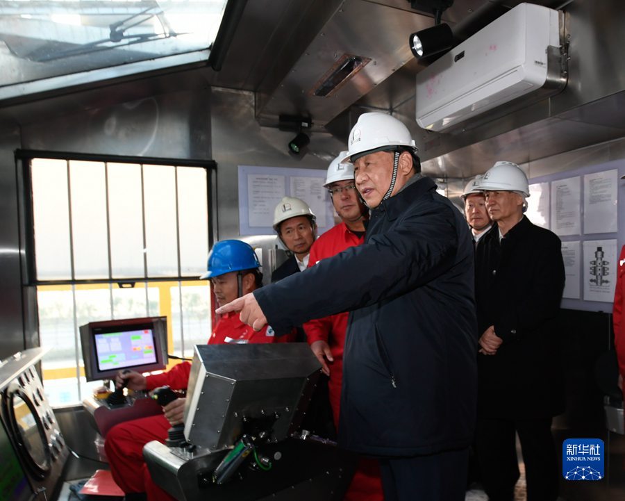 10月22日下午,中共中央總書記、國家主席、中央軍委主席習(xí)近平在山東省濟(jì)南市主持召開深入推動(dòng)黃河流域生態(tài)保護(hù)和高質(zhì)量發(fā)展座談會(huì)并發(fā)表重要講話。這是座談會(huì)前,習(xí)近平21日下午在位于東營市萊州灣的勝利油田萊113區(qū)塊考察時(shí),登上二層鉆井平臺(tái),察看鉆井自動(dòng)化設(shè)備。 新華社記者 李學(xué)仁 攝