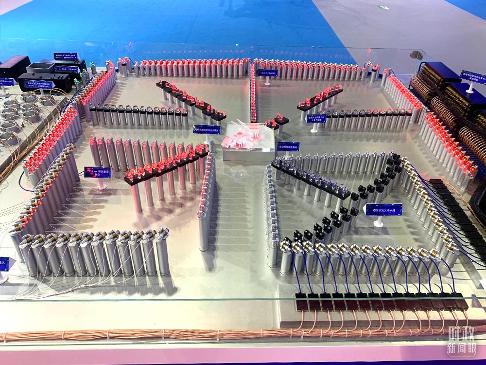 △“九章”量子計(jì)算原型機(jī)模型。它處理“高斯玻色取樣”的速度比超級(jí)計(jì)算機(jī)快一百萬(wàn)億倍,也就是說(shuō)“九章”一分鐘完成的任務(wù),超級(jí)計(jì)算機(jī)需要一億年。(總臺(tái)央視記者范一鳴拍攝)