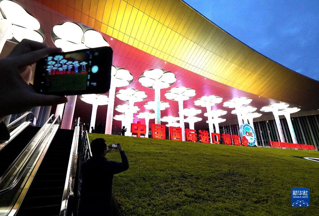 2018年11月4日,人們在拍攝國家會展中心(上海)場館夜景。2018年11月5日,首屆中國國際進(jìn)口博覽會在上海開幕。新華社記者 陳飛 攝
