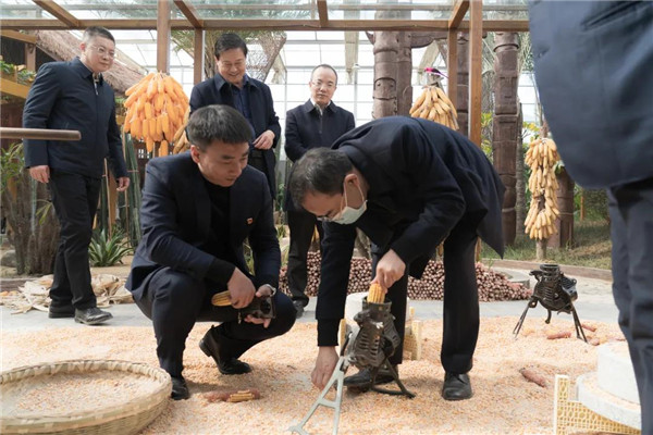 在上古農(nóng)耕文化、現(xiàn)代農(nóng)業(yè)科技與地方特色農(nóng)業(yè)相結(jié)合的神農(nóng)百草園里,高廳長(zhǎng)饒有興趣的親自體驗(yàn)農(nóng)事活動(dòng)的玉米脫粒。調(diào)研組一行還參觀了各項(xiàng)高科技栽培種植及研學(xué)課堂區(qū)域。