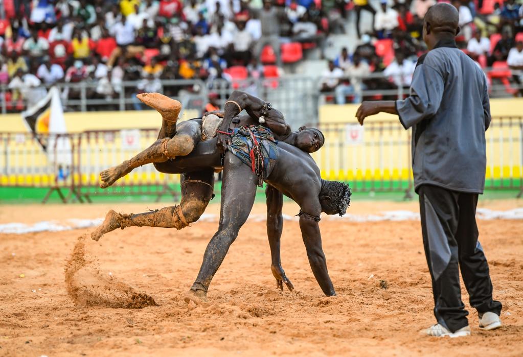 11月21日,在塞內(nèi)加爾首都達(dá)喀爾,選手在塞內(nèi)加爾競(jìng)技摔跤場(chǎng)內(nèi)比賽。