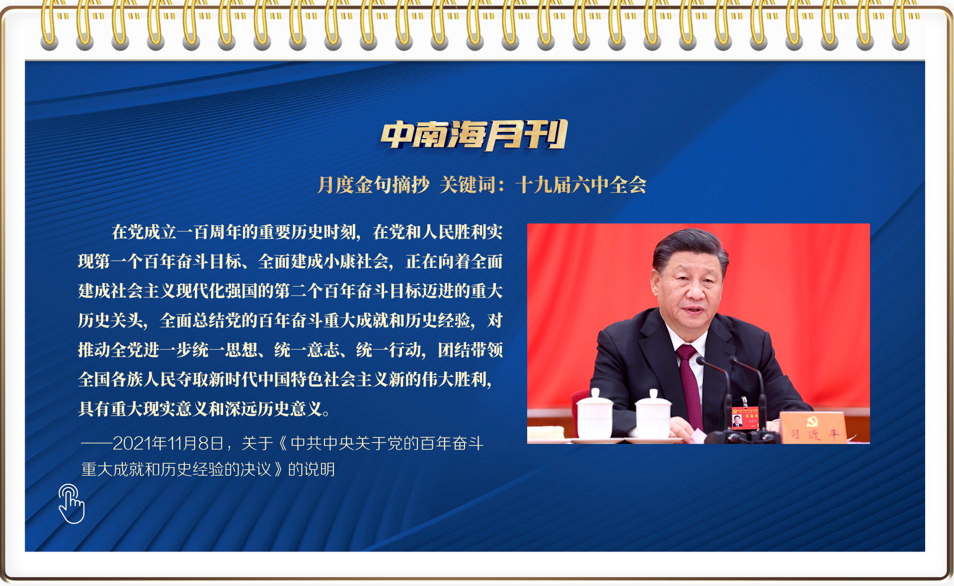 這個月,中國共產(chǎn)黨第十九屆中央委員會第六次全體會議(以下簡稱十九屆六中全會)在京召開,習(xí)近平總書記作重要講話。全會審議通過了《中共中央關(guān)于黨的百年奮斗重大成就和歷史經(jīng)驗的決議》,《決議》總結(jié)了黨團結(jié)帶領(lǐng)人民群眾百年奮斗的重大歷史成就,凝聚起向第二個百年奮斗目標奮進的強大力量。