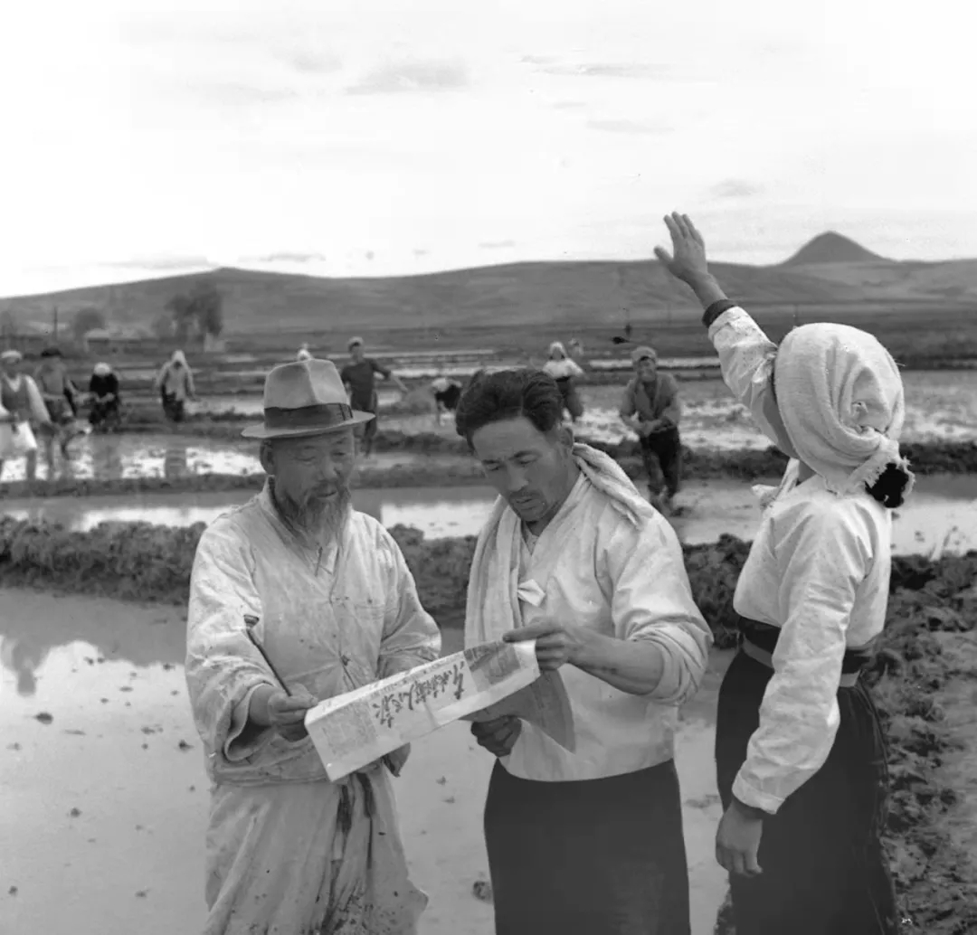 1954年6月26日,“中華人民共和國憲法草案”公布的消息傳到了吉林省延邊朝鮮族自治區(qū),正在田間勞動的崔竹松農業(yè)生產合作社社員們爭相趕來閱讀公布憲法草案的好消息。新華社發(fā)