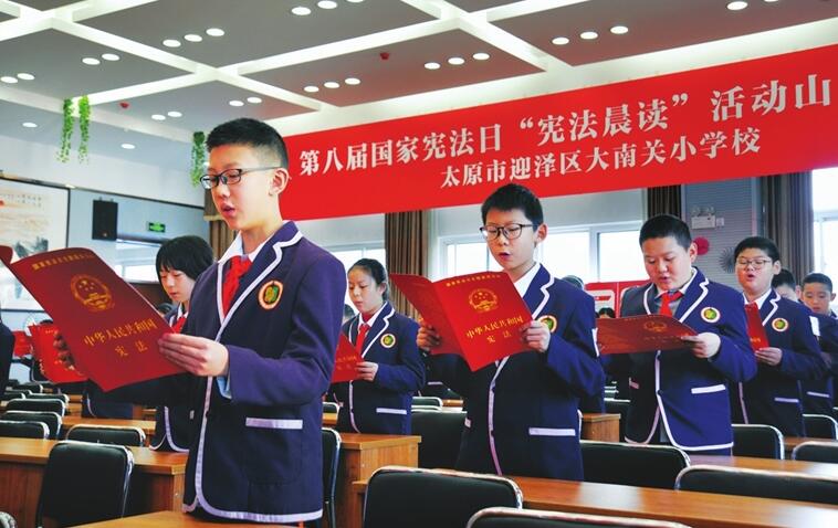 12月3日,迎澤區(qū)大南關小學開展“憲法晨讀”活動。該校作為第八屆國家憲法日“憲法晨讀”山西分會場,通過讓學生們朗讀憲法、收看直播等方式宣傳憲法知識。(徐浩軒 攝)