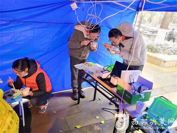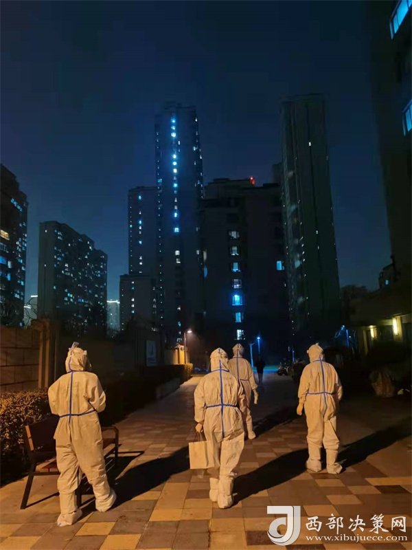 正當隊員們準備修整一天時,新的命令到了,要求醫(yī)療隊安排300名隊員支援雁塔區(qū)核酸采集工作,大家毫無怨言,坐上了趕赴雁塔區(qū)的大巴。這是最不尋常的一天,醫(yī)療隊承擔了雁塔區(qū)近10個居民區(qū)的核酸采樣任務,且大部分都屬于封控區(qū)。核算采樣需上門采集,風險大、難度高,因為信息采集設備無法上樓,只能依靠人工信息錄入,隊員們身穿防護服,在操作極其困難的情況下做到了不漏一戶,不落一人。采集結(jié)束已是25日凌晨1點,來自漢臺區(qū)的余晗和趙凌最后的采集任務已是凌晨2點,此時的千年古都正飄落著冬日的雪花。這次入戶采集共完成49081人次