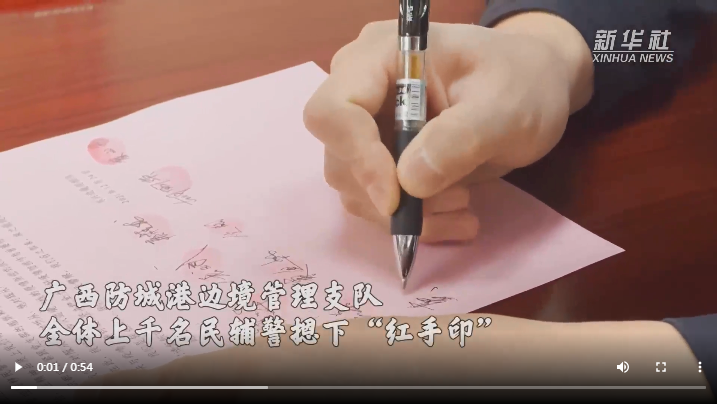 廣西防城港邊境管理支隊上千名民輔警集體遞交“戰(zhàn)疫請戰(zhàn)書”,主動要求向抗疫最前線靠攏。他們繼續(xù)選擇逆行,奔赴國門口岸、邊境卡口、村寨社區(qū),始終奮戰(zhàn)在最前線,維護(hù)檢測現(xiàn)場秩序,保障救援力量通行,強化邊境巡邏防控。“請戰(zhàn)書”上的一個個“紅手印”,見證忠誠。