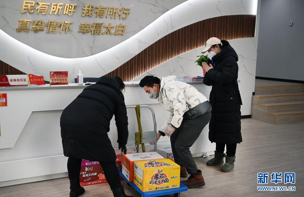 12月27日,社區(qū)居民(左)專門(mén)送來(lái)方便面等食品,慰問(wèn)志愿者們。新華社記者 陶明 攝