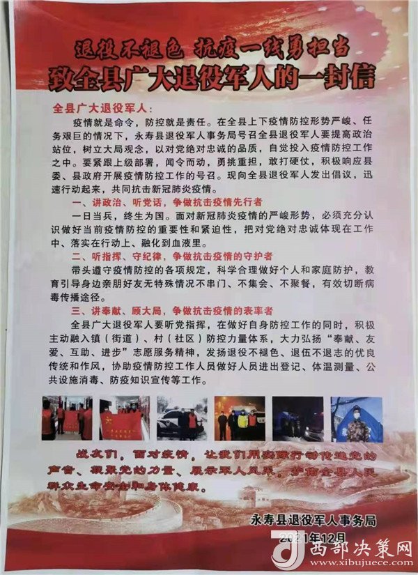 西部決策網(wǎng)訊(王江) “我志愿加入永壽縣退役軍人志愿者服務(wù)隊,不記報酬,不論生死,聽從黨和政府安排,絕不退后!退役不褪色、退伍不落伍、轉(zhuǎn)業(yè)不轉(zhuǎn)志”,退役軍人依然是人民的子弟兵,心中時刻裝著祖國和人民,在新型肺炎疫情來襲之際,退役軍人紛紛請戰(zhàn)。
