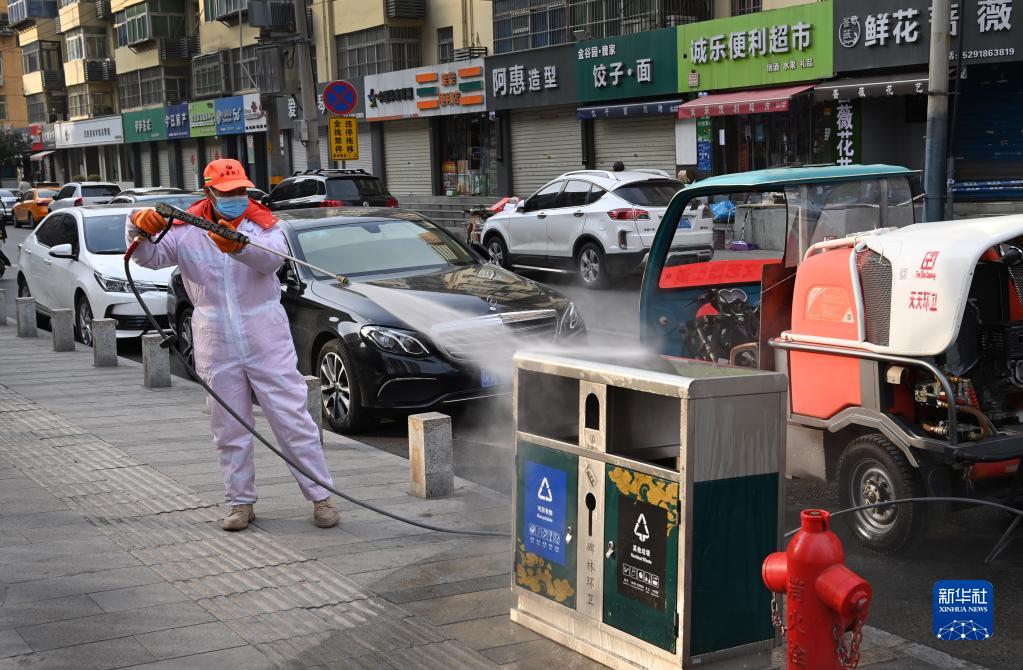 12月28日,環(huán)衛(wèi)人員在西安市文藝路對(duì)垃圾桶進(jìn)行消殺。新華社記者 陶明 攝