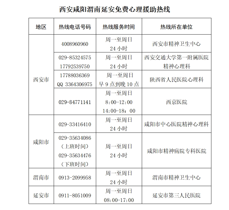 省新冠肺炎疫情醫(yī)療救治心理干預專家組,組建心理援助熱線工作團隊,24小時為疫情心理求助者提供心理援助服務。同時,省衛(wèi)生健康委會同省政務服務中心在省12320衛(wèi)生熱線開通疫情心理援助熱線專席,依托陜西12345對全省有關(guān)疫情心理干預的訴求進行引導和分轉(zhuǎn)。