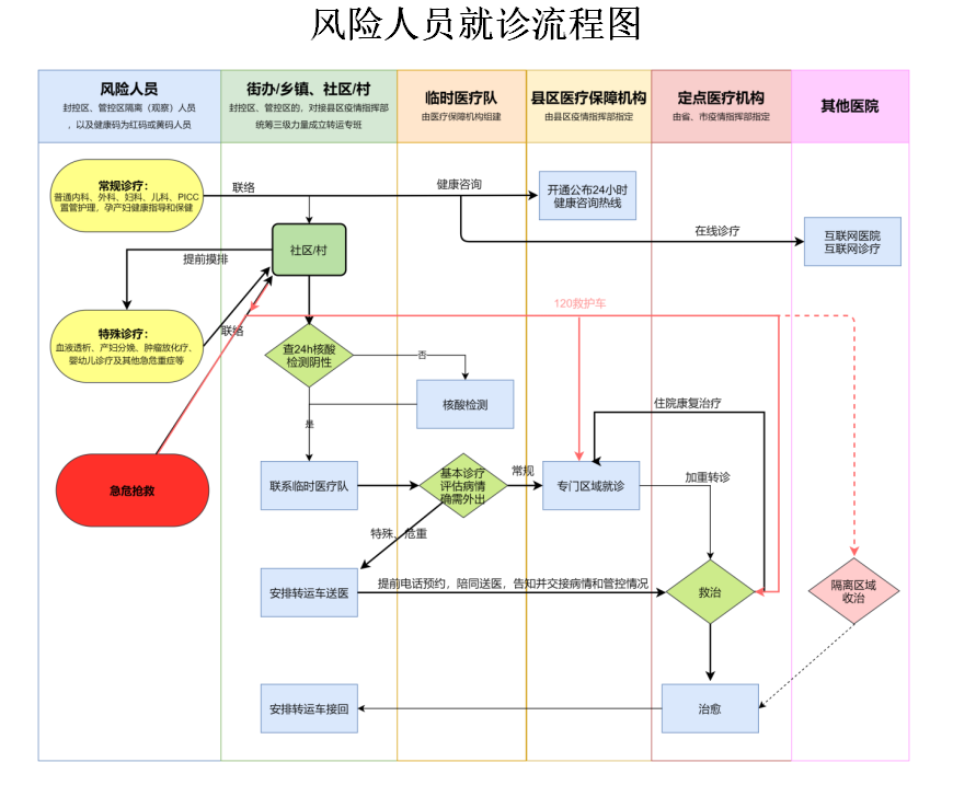 有急診搶救醫(yī)療需求的風險人員,直接撥打120急救電話,同時通知社區(qū)(村)工作人員對接120救護車、填寫人員交接單,由120救護車聯(lián)系風險人員醫(yī)療保障醫(yī)療機構(gòu)、定點醫(yī)療機構(gòu),或就近送至具備相應診療能力的醫(yī)療機構(gòu)。診療結(jié)束后,醫(yī)療機構(gòu)聯(lián)系社區(qū)(村)由縣區(qū)轉(zhuǎn)運專班“點對點”接回。