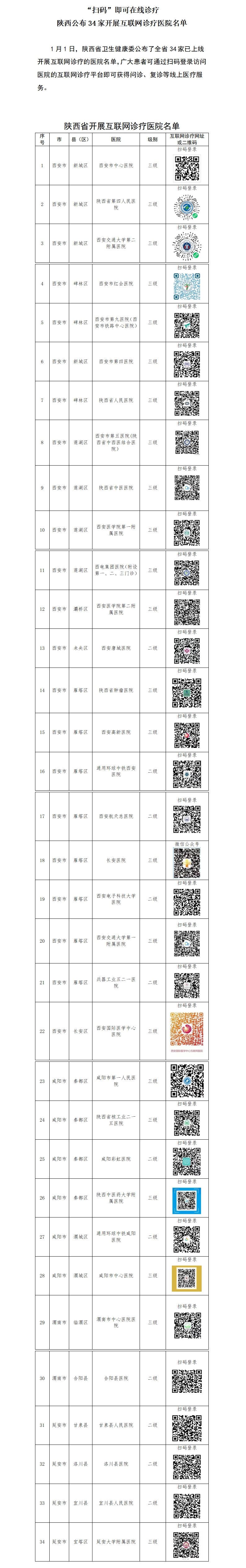 西安、咸陽、渭南、延安34家醫(yī)院已上線互聯(lián)網(wǎng)診療服務,廣大患者可通過掃碼登錄訪問醫(yī)院的互聯(lián)網(wǎng)診療平臺即可獲得問診、復診等線上醫(yī)療服務。
