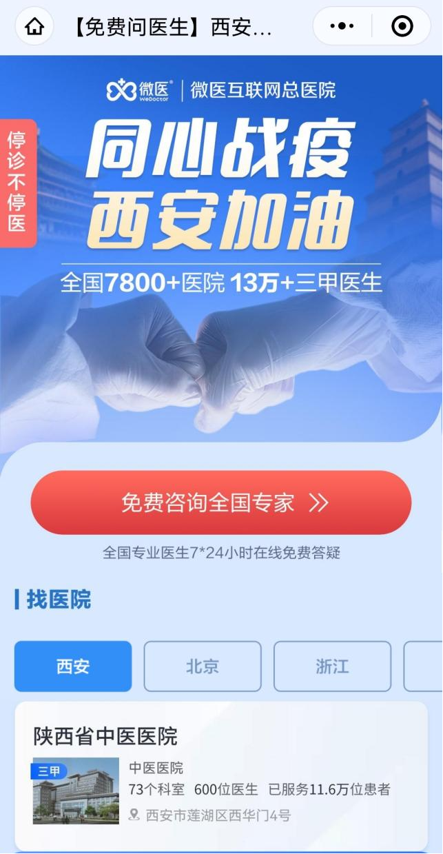 為保障當?shù)厝罕娽t(yī)療健康需求,緩解線下醫(yī)療機構壓力,微醫(yī)互聯(lián)網(wǎng)總醫(yī)院第一時間啟動疫情防控應急方案,于22日迅速上線“西安抗疫專區(qū)”,集結全國專家為西安百姓免費提供7*24小時不間斷的在線咨詢、防疫科普等服務。