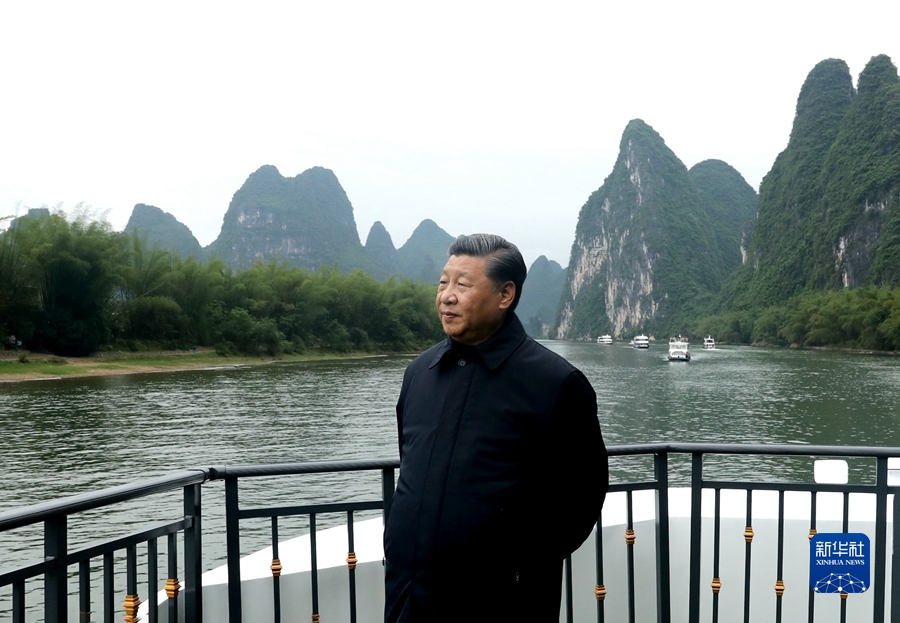 2021年4月25日至27日,中共中央總書記、國家主席、中央軍委主席習近平在廣西考察。這是25日下午,習近平在桂林市陽朔縣,乘船考察漓江陽朔段。