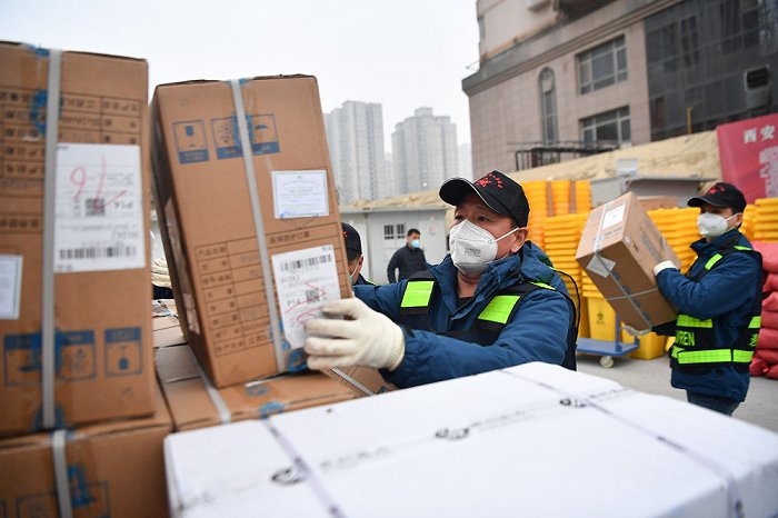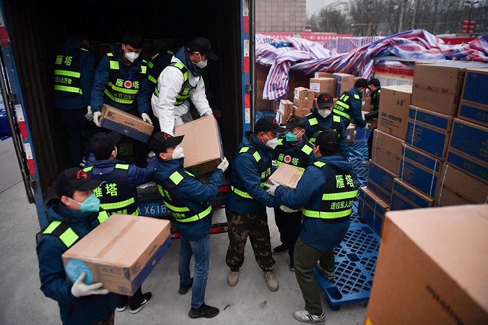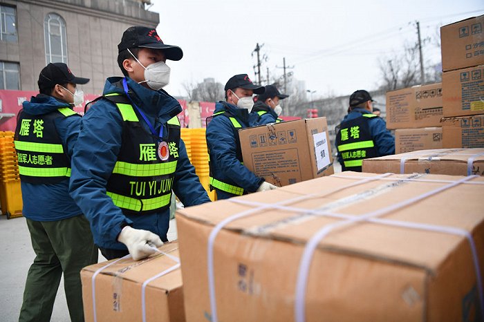 ↑1月6日,西安市雁塔區(qū)退役軍人志愿突擊隊隊員搬運防疫物資。