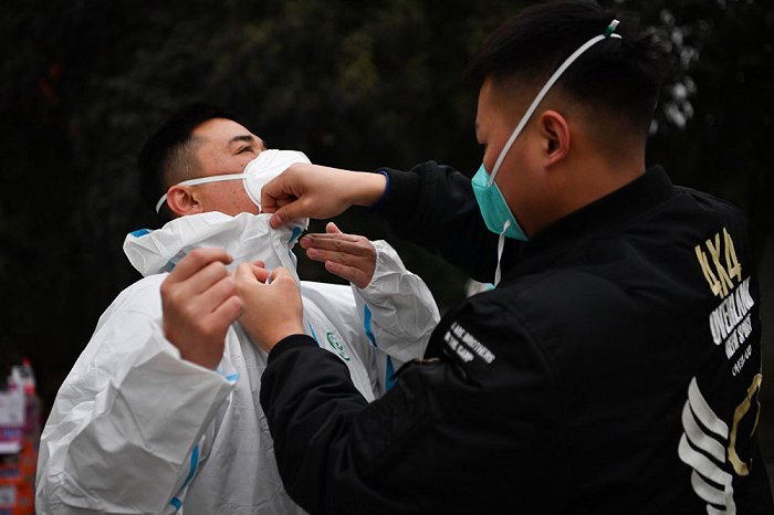 ↑1月7日,西安市雁塔區(qū)退役軍人志愿突擊隊隊員在一處核酸檢測點互相協(xié)助為防護服消毒。