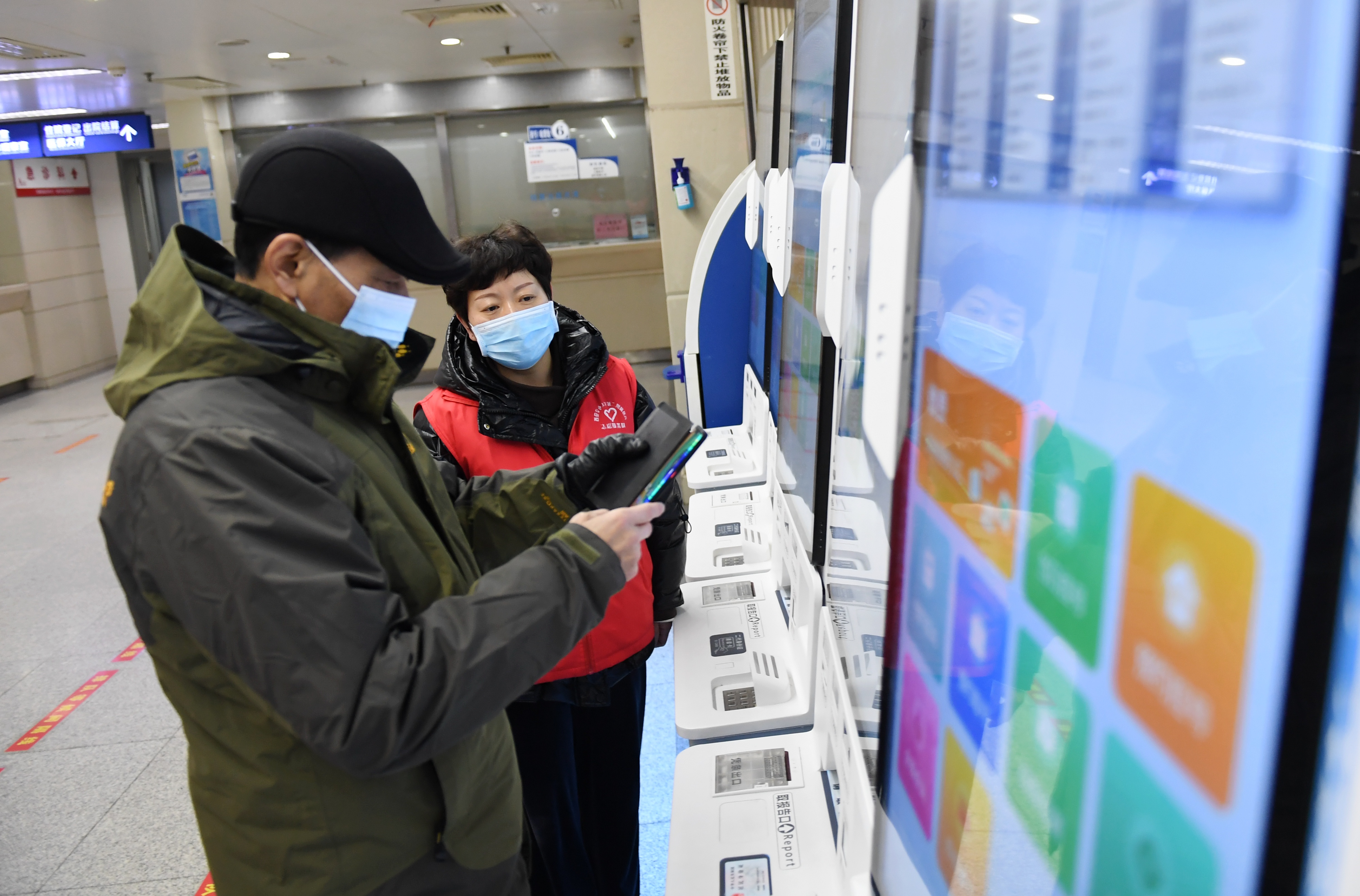1月8日,在西安交通大學(xué)第二附屬醫(yī)院,志愿者協(xié)助就診患者支付掛號費(fèi)。新華社記者 李一博 攝