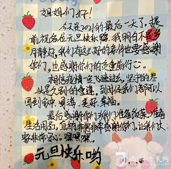 12月31日晚,即將迎來我國傳統(tǒng)佳節(jié)元旦。隔離學(xué)生怡忻悅通過手機向田甜發(fā)來了一張留言卡片,“姐姐好!今天是2021年的最后一天了,提前祝大家元旦快樂。我明白不是歲月靜好,我們有這么好的條件要感謝你們,感謝你們的負重前行。相信疫情一定飛速過去,堅守的盡頭是久別的重逢,到時候我們都可以回到家中,圓滿、美好、幸福。最后感謝你們?yōu)槲覀儨蕚滹埐?,準備生活用品,讓我們大家非常安心?rdquo;學(xué)生們一句句發(fā)自肺腑、情真意切的心里話在這數(shù)九寒天里溫暖和鼓舞著每一名后勤保障人員,讓大家的疲憊一掃而空,渾身充滿了干勁和戰(zhàn)勝疫情的巨大信心。