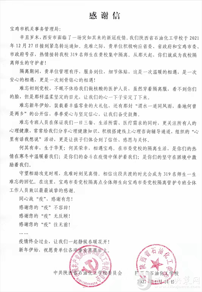 西部決策網(wǎng)訊 (任書彥)12月27日晚9時,寶雞市機關(guān)事務(wù)管理局接到緊急命令:來自陜西省石油化工學(xué)校319名學(xué)生將于28日早6時到達寶雞市委黨校開始集中隔離,寶雞市機關(guān)事務(wù)管理局負責(zé)此次隔離學(xué)生的后勤保障工作。這是寶雞市機關(guān)事務(wù)管理局自全國十四運會、第八屆特奧會之后,又迎來的一次“大考”。